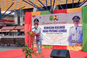 Pj Walikota Tanjungpinang Hasan menyampaikan sambutan peresmian operasional kawasan kuliner Akau Potong Lembu yang baru selesai direvitalisasi, Minggu (24/12/2023). Foto humpro