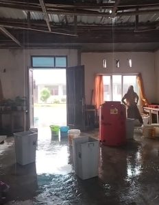 Genangan air terlihat di lantai, sementara beberapa meja ditutupi plastik agar tidak basah.