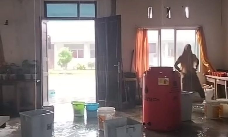 Ketika hujan turun, air menetes dari langit-langit ke meja guru dan lantai.