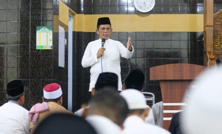 Gubernur H Ansar Ahmad memberikan tausiahdi  Masjid Asy Syuhada Bengkong Laut Kota Batam, Minggu (17/4). Foto Ist