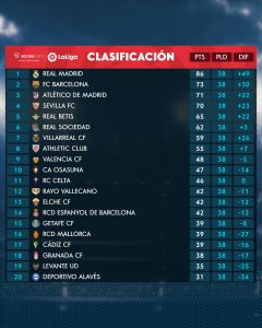 Alhasil Barcelona finish di peringkat dua, disusul Atletico Madrid dan Sevilla di pSementara untuk tiga jatah ke Liga Europa dan Confrence League didapatkan Real Betis, Real Sociedad, dan Villarreal.