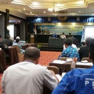 Tampak tiga orang Steering Committee Muscab II Peradi Tanjungpinang bersama seluruh peserta tengah mempersipkan prosesi pemilihan, setelah laporan pertanggungjawaban pengurus sebelumnya, di Hotel Comfort, Sabtu sore (10/2/2018). Foto prokepri.com/MASRUN.