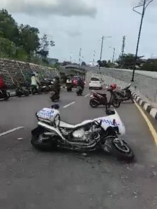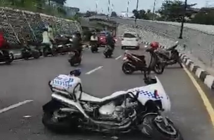 Dalam video, tampak kendaraan roda dua yakni Motor Gede (Moge) milik Satlantas Polresta Tanjungpinang terbaring ringsek di tengah jalan Flyover tersebut.