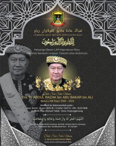 Ketua Umum LAM Kepri, Dato’ Seri Setia Utama, H Raja Alfahis Raja Ismail turut menyampaikan ucapan takziah serta menyatakan duka mendalam atas berpulangnya Drs H Abdul Razak bin Abu Bakar bin Ali.