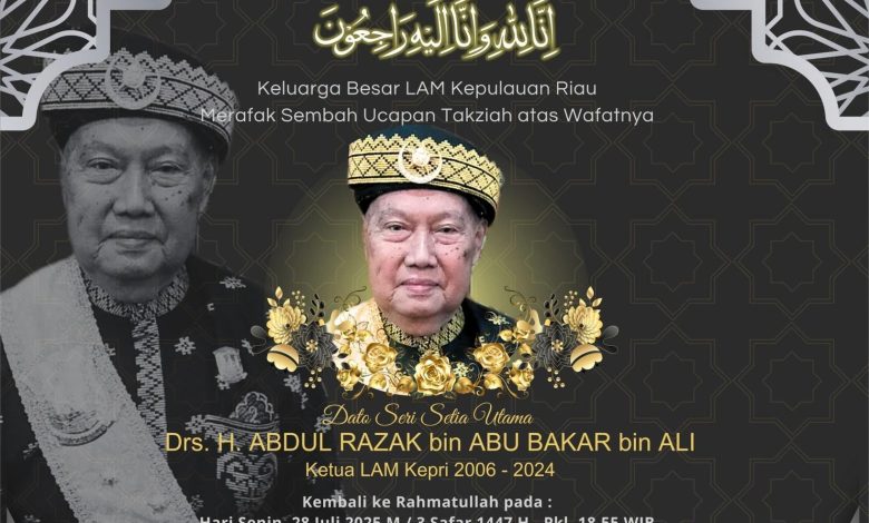 “Innalillahiwainnailaihirojiun. Keluarga besar LAM Kepulauan Riau merafak sembah ucapan takziah atas wafatnya Dato Seri Setia Utama Drs H Abdul Razak bin Abu Bakar bin Ali, Ketua LAM Kepri 2006-2024,”demikian bunyi pernyataan Raja Alhafiz yang diterima, Senin malam (29/7/2025).