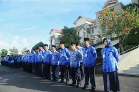 Wakil Walikota Hj Rahma beserta Sekda dan Kepala OPD dilingkungan Pemko Tanjungpinang mengikuti upacara bendera hari lahir Pancasila di kantor walikota Senggarang. Foto Ist
