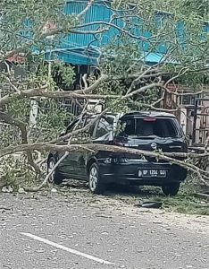 Akibatnya, beberapa pohon besar di sejumlah titik lokasi ruas jalan bertumbangan hingga menimpa satu unit mobil.