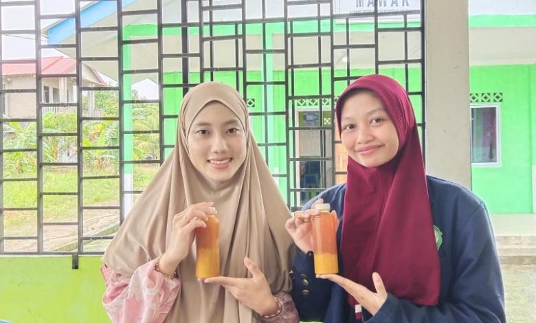 Tampak mahasiswi KKN STAIN Kepri melihatkan jamu tradisional racikan ibu-ibu rumahan di kegiatan rutin Posyandu Mawar di Desa Sri Bintan, Minggu (13/7/2025). Foto stainkepri