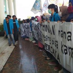Tampak mahasiswa membentangkan spanduk bertuliskan aspirasi mereka salah satunya minta rektor turun dari jabatannya dalam aksi demo lanjutan di gedung rektorat Umrah, Selasa (20/2/2018). Foto prokepri.com/CR1.