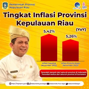 PROKEPRI.COM,TANJUNGPINANG – Inflasi di Provinsi Kepulauan Riau bulan November 2022 yang berada di bawah inflasi nasional mendapatkan apresiasi dari Menteri Dalam Negeri RI Tito Karnavian. Dari data Badan Pusat Statistik (BPS), inflasi Provinsi Kepri secara year on year (yoy) sebesar 5,26 persen, berada di bawah inflasi nasional bulan November 2022 yang secara year on year (yoy) tercatat sebesar 5,42 persen.