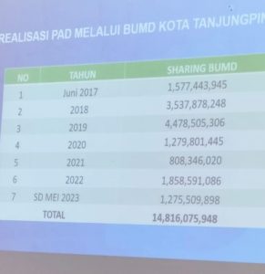 PROKEPRI.COM, TANJUNGPINANG – PT Pelindo (Persero) Regional 1 Cabang Tanjungpinang membeberkan realiasi Pendapatan Asli Daerah (PAD) pungutan PAS masuk Pelabuhan Sri Bintan Pura (SBP) melalui PT Tanjungpinang Makmur Bersama (TMB) yang merupakan Badan Usaha Milik Daerah (BUMD) sejak Juni 2017 sampai Mei tahun 2023 berjumlah total Rp14,816,075,948 (14,8 miliar lebih). Anehnya, yang masuk menjadi deviden (bagian dari keuntungan perusahaan kepada pemegang saham,red) yakni Pemko Tanjungpinang hanya berjumlah Rp200 juta.