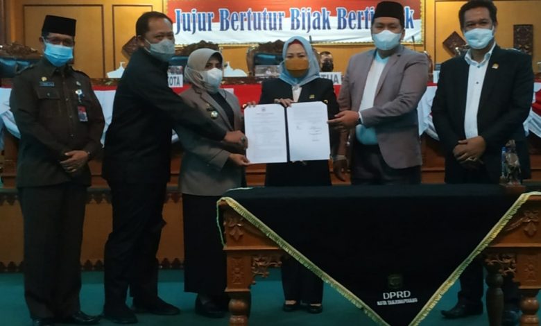 Walikota Hj Rahma menerima berkas pengesahan APBD 2022 dari pimpinan DPRD. Foto Ist