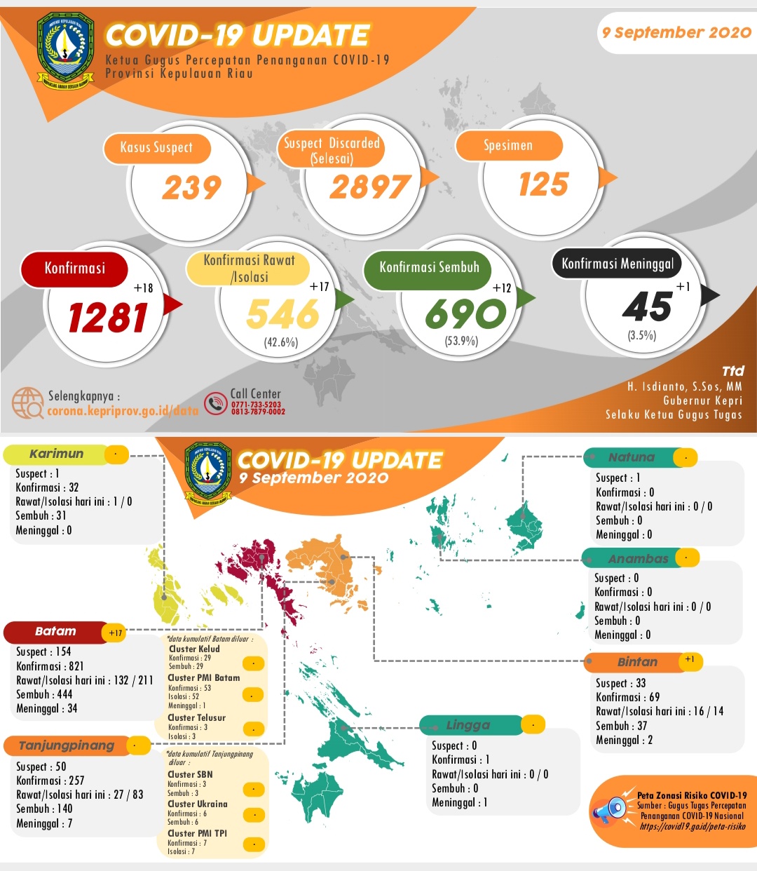 PROKEPRI.COM, TANJUNGPINANG – Pemerintah Provinsi (Pemprov) Kepri kembali mengumumkan kasus positif virus Corona (COVID-19) pada Rabu (09/09/2020) bertambah 18 kasus terkonfirmasi, sehingga jumlah positif corona naik menjadi 1281 orang.