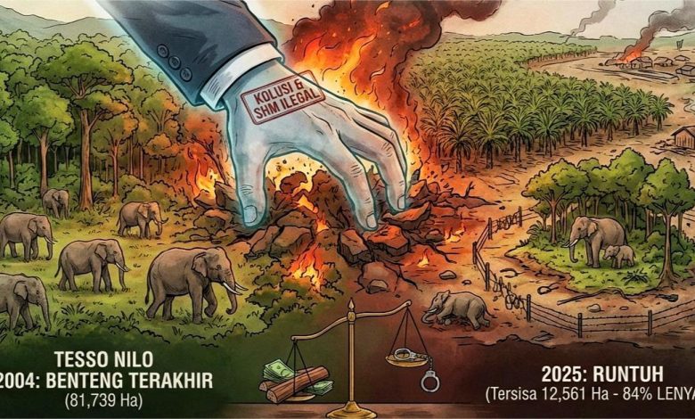 PROKEPRI.COM, OPINI – Taman Nasional Tesso Nilo ditetapkan pada 2004 sebagai benteng terakhir hutan dataran rendah Sumatera dan habitat gajah Sumatera. Namun dua dekade lebih berselang, benteng itu runtuh: dari 81.739 hektare, hutan yang masih utuh disebut tinggal 12.561 hektare, sekitar 84 persen lenyap.